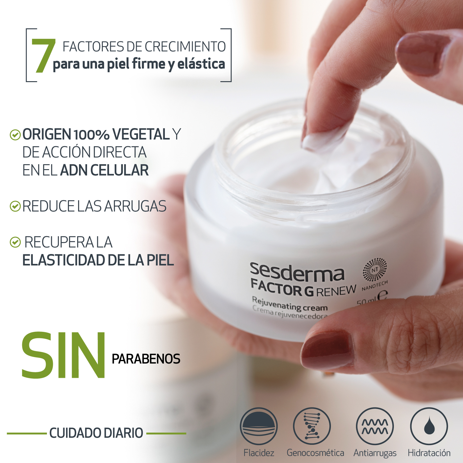 Con el fin de prevenir y tratar las manifestaciones del envejecimiento cutáneo, Factor G incorpora factores de crecimiento de origen vegetal que reactivan el funcionamiento de la piel, estimulando la síntesis de colágeno y elastina. Todo esto se traduce en una mejora del estado de la piel, aportándole juventud y vitalidad. Adicionalmente, la centella asiática y las células madre aportan propiedades antioxidantes (protegiendo la piel de las agresiones de los radicales libres), reparadoras y regeneradoras. También son activos con propiedades antiinflamatorias, que no causan irritaciones, exfoliación, ni aumentan la sensibilidad al sol, de ahí que sea idóneo para pieles sensibles y reactivas.
