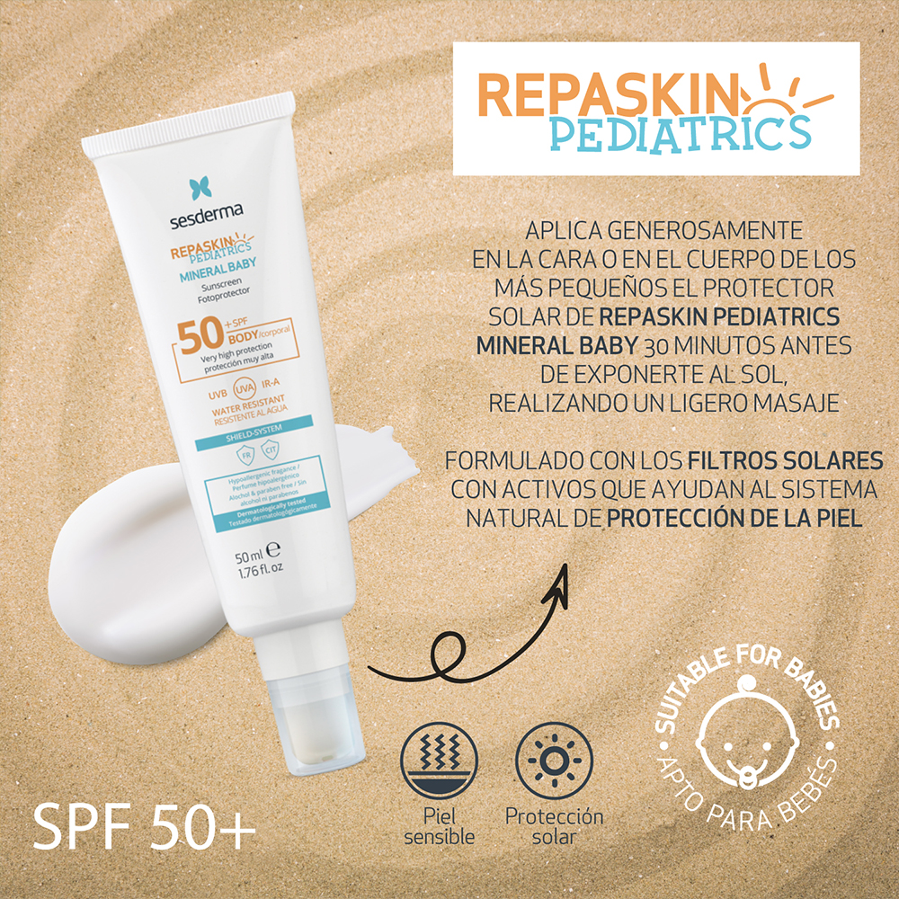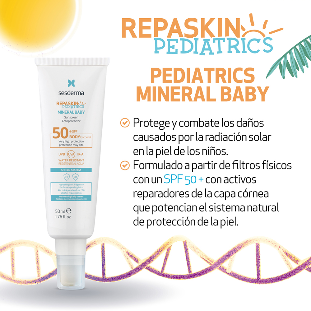 Repaskin Pediatrics Mineral Baby está formulado con los filtros físicos más recomendables para crear una fuerte barrera protectora, además de ser WATER RESISTANT para que puedan bañarse con tranquilidad.
